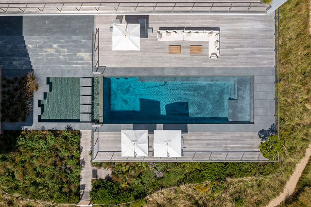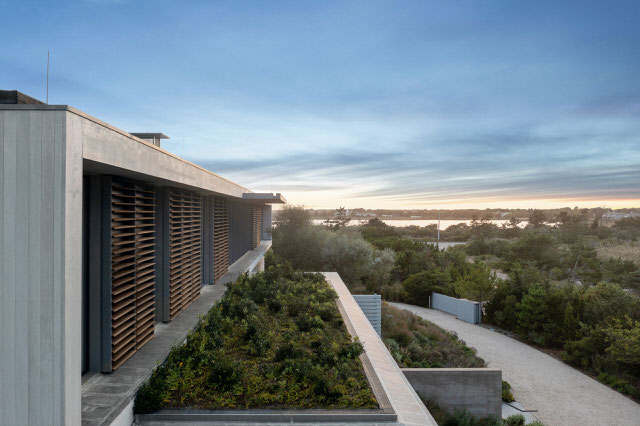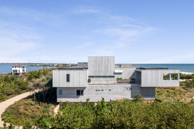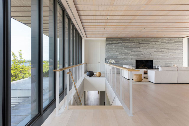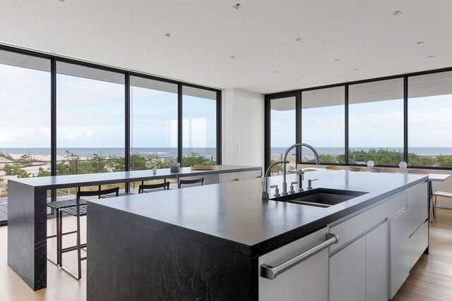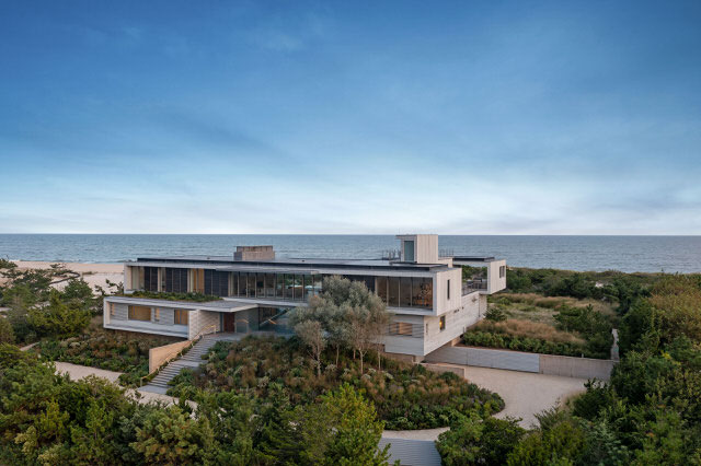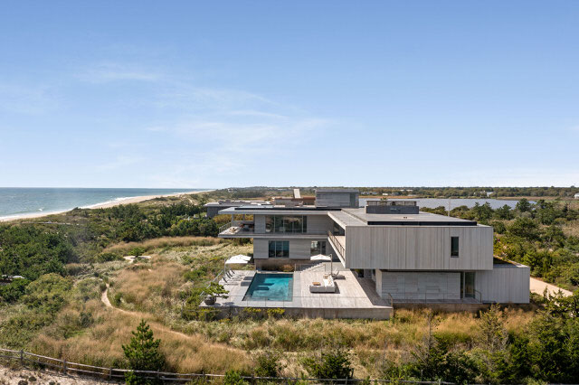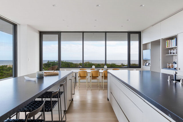 Water views from every room. The linear geometry of this modern beach house hugs the lean narrow isthmus that bisects a bay and the Atlantic Ocean on the south shore of Long Island. Its pale profile complements the sand and sea, and the deftly arranged floor-to-ceiling windows provide a thrilling transparency throughout this unique property.
