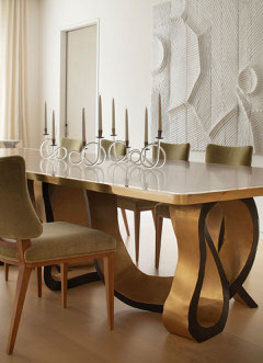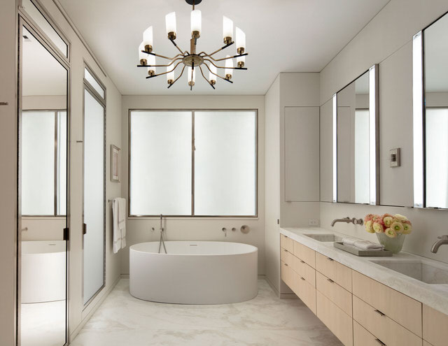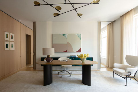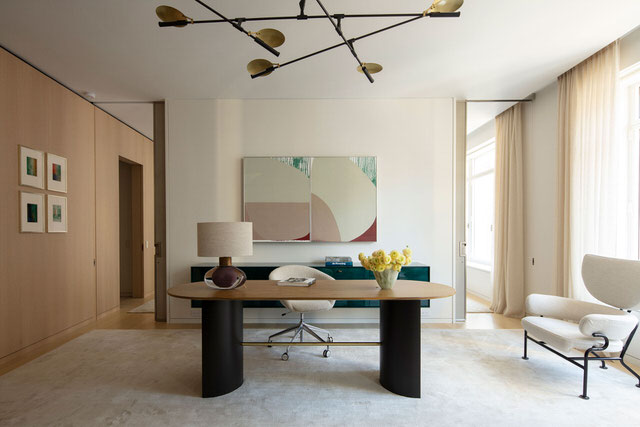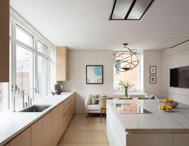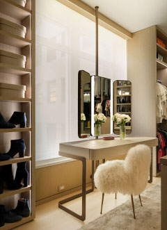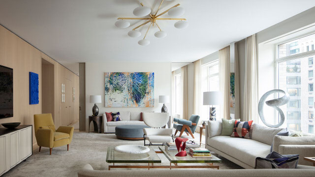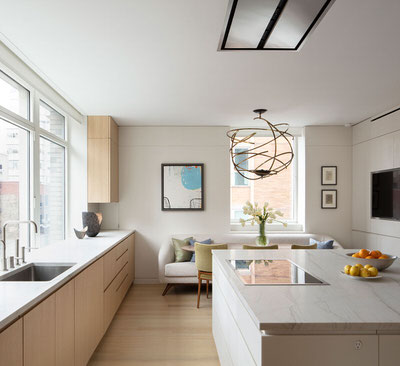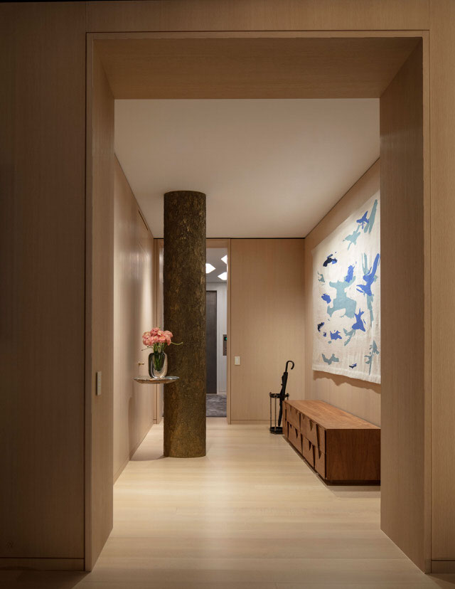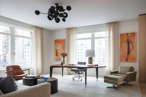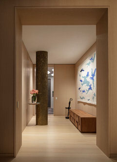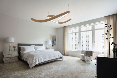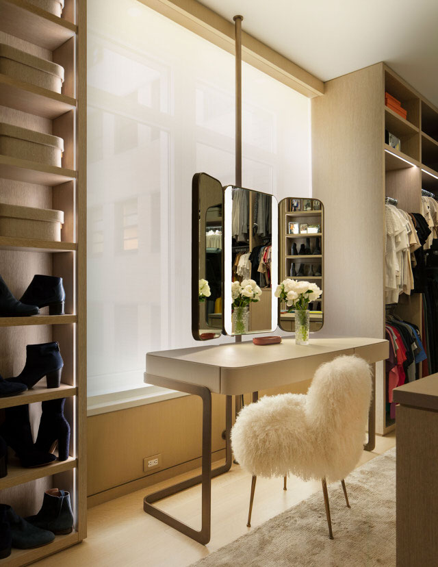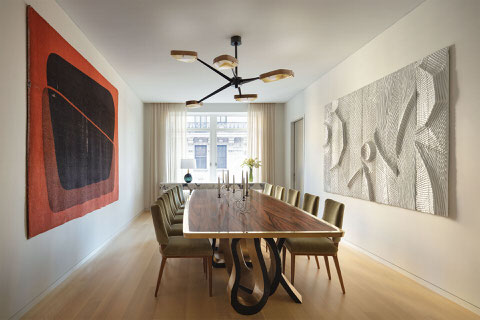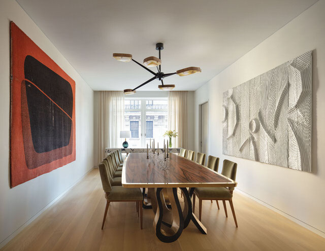 Situated in an elegant limestone prewar revival building, this residence received a bold reductionist make-over, banishing crown moldings, box panels and non-essential decoration, as well as a reduction of the original 4 bedrooms into just one. Since their children are grown and on their own, the owner’s considerable collection of modern art, furnishings and lighting now enlivens the expanded layout for entertaining. The extra closets are an enviable bonus.