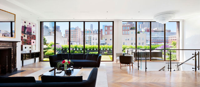 Elite downtown conversions of prewar commercial buildings offer landmarked character with loft-like layouts. This duplex penthouse was customized with generous opposing terraces on the open plan entry floor and conversion of a 2nd bedroom on the lower level to a walk-in closet. “Paparazzi-proof” amenities include drive-in underground arrival with valet, a 2nd lobby with private elevators and an enclosed central courtyard.